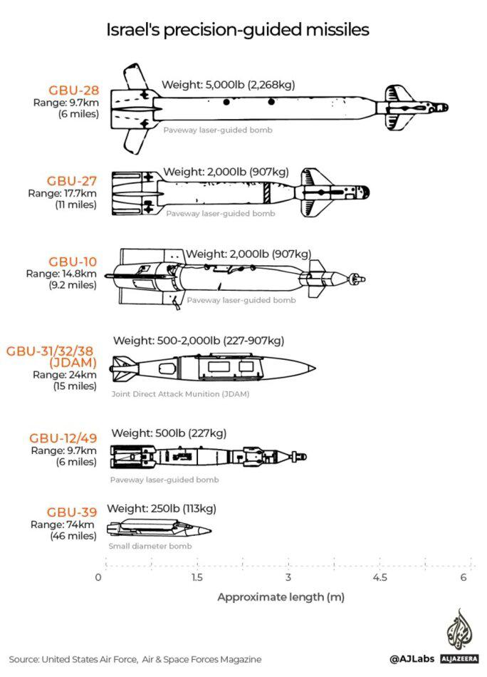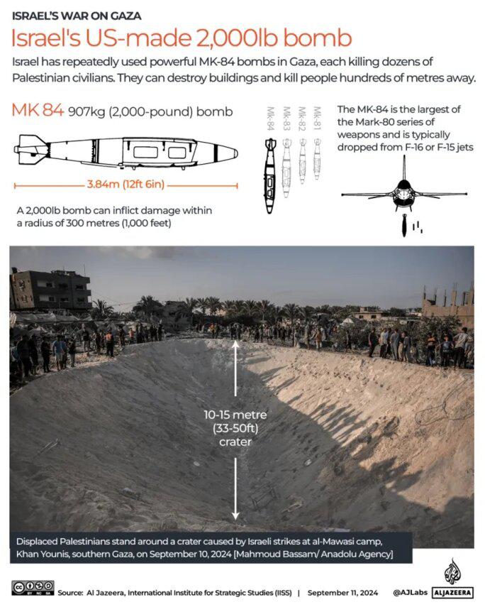 - BLU-109 bunker buster : Utilisée lors d’une attaque contre al-Mawasi, une zone qu’Israël avait déclarée « zone sûre » pour les Palestinien.nes déplacés de force en septembre 2024, cette bombe a fait évaporer 22 personnes. Elle a un boîtier en acier et une fusée à retardement, s’enfouissant avant de faire détoner un mélange explosif PBXN-109. Cela crée une grande boule de feu à l’intérieur d’espaces clos, incinérant tout ce qui est à portée.