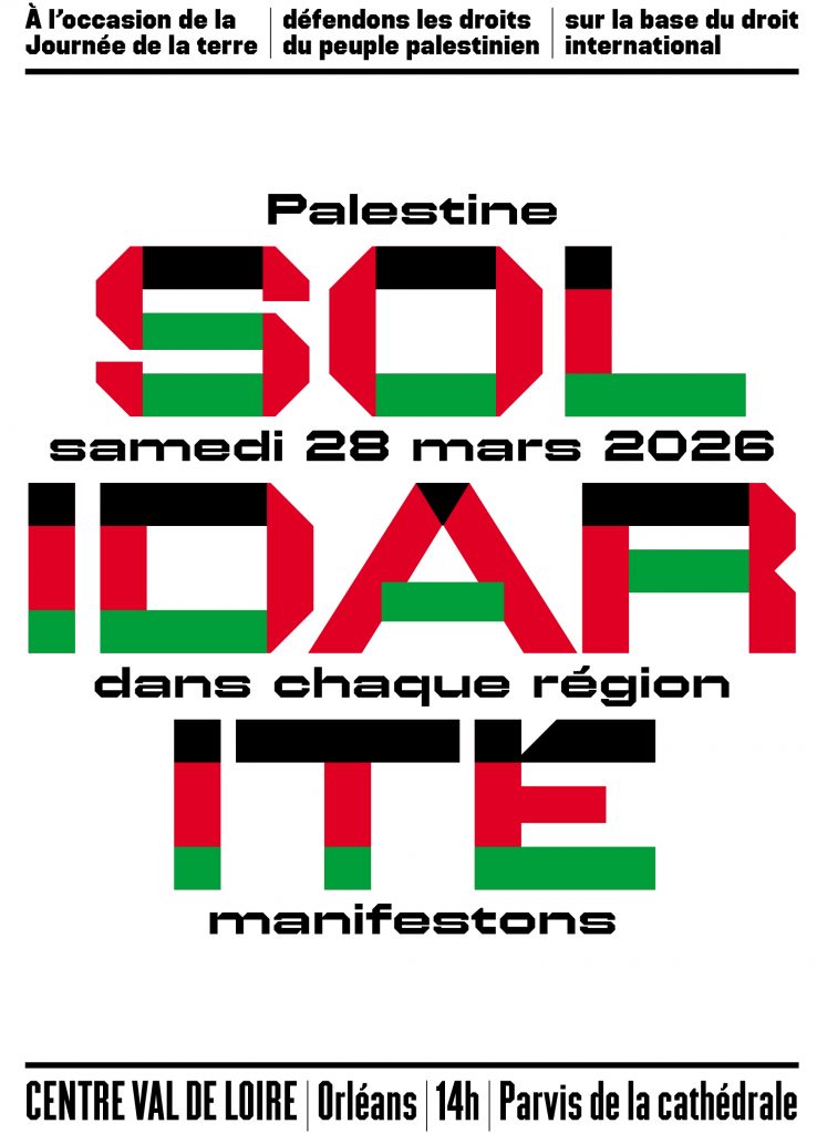 PALESTINE : Manifestation Régionale Centre Val de Loire à Orléans Samedi 28 mars à 14h Parvis de la Cathédrale !